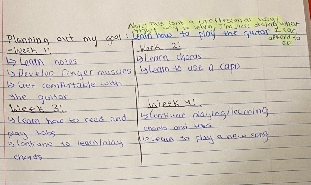 Write/type it out. Write/type out what you want to achieve, the steps you plan to take to achieve said goal, and other things you think might be important to include. (see the picture below for a reference.)